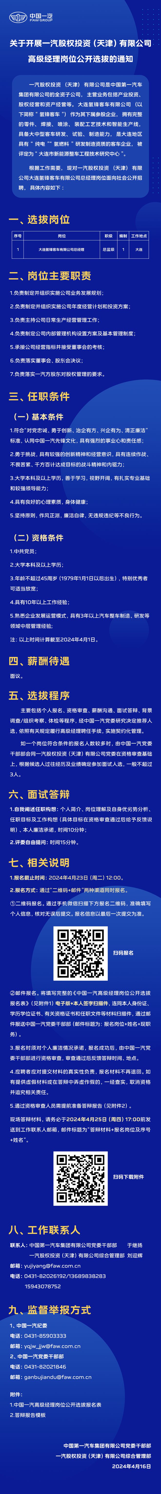 一汽股权投资(天津)有限公司高级经理岗位公开选拔